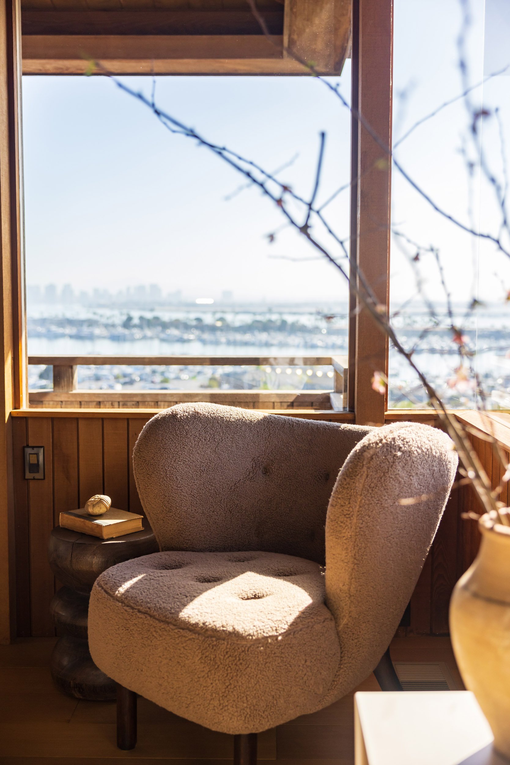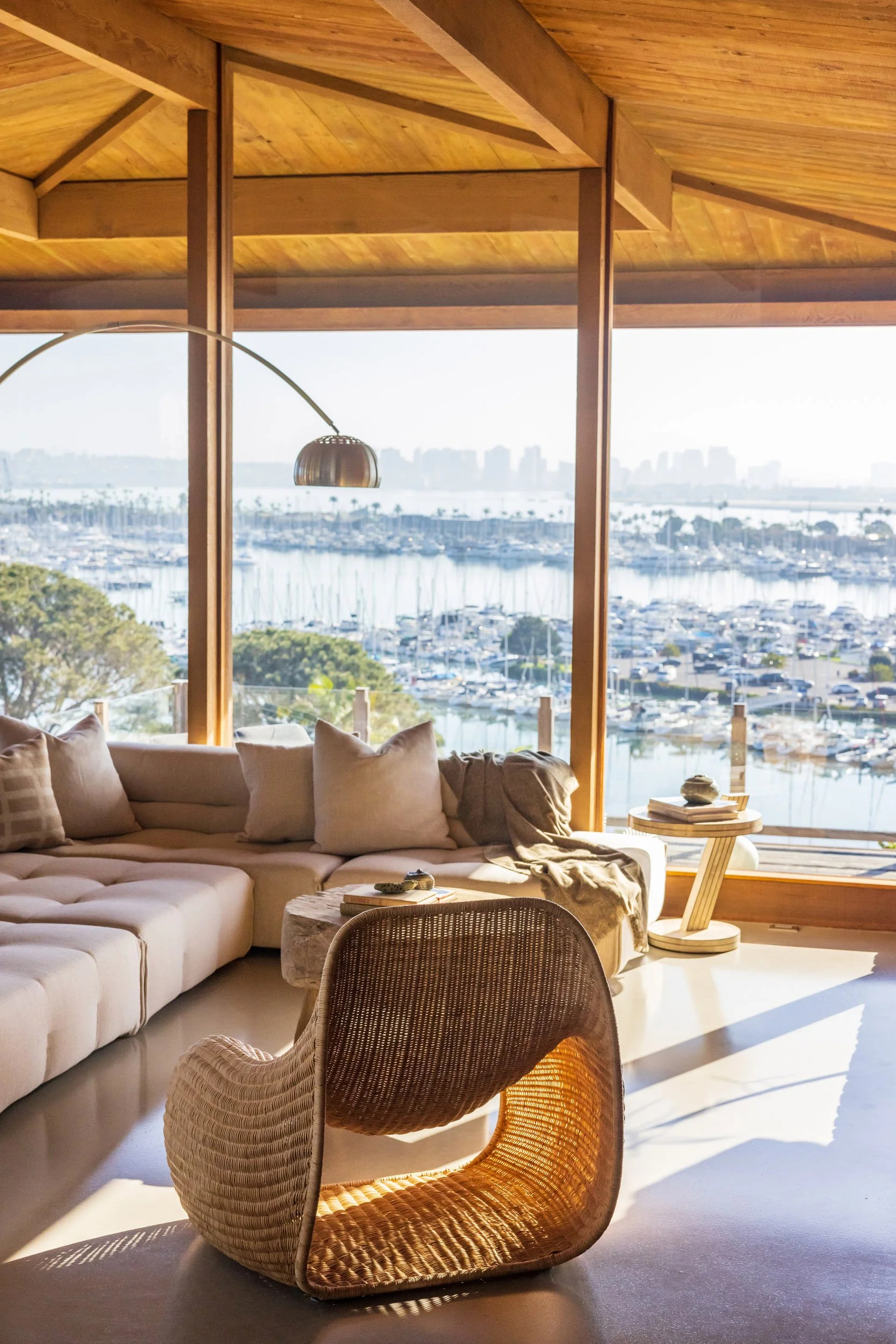 Thanks to its hillside location, the home is filled with a magical quality of natural light from the moment the sun rises until it sets, then allowing the moonlight to take over. Views frame the quiet excitement of the marina, Downtown San Diego’s skyline, and the Coronado Bridge. In winter, there are snow-capped mountains to the east.