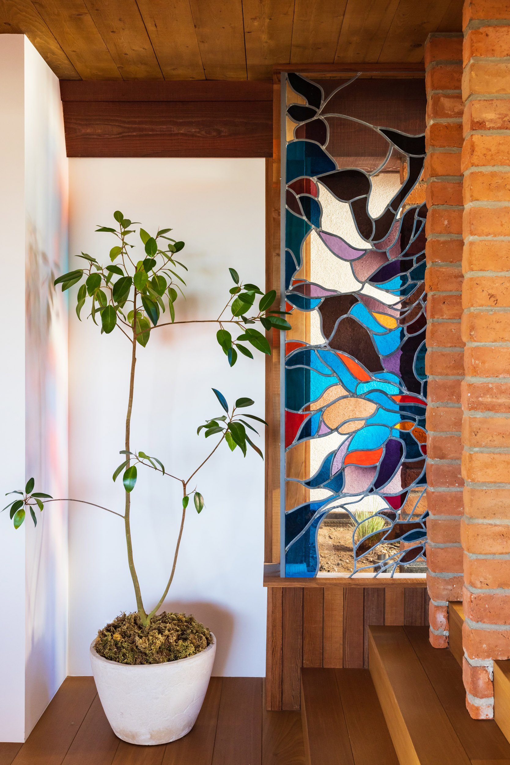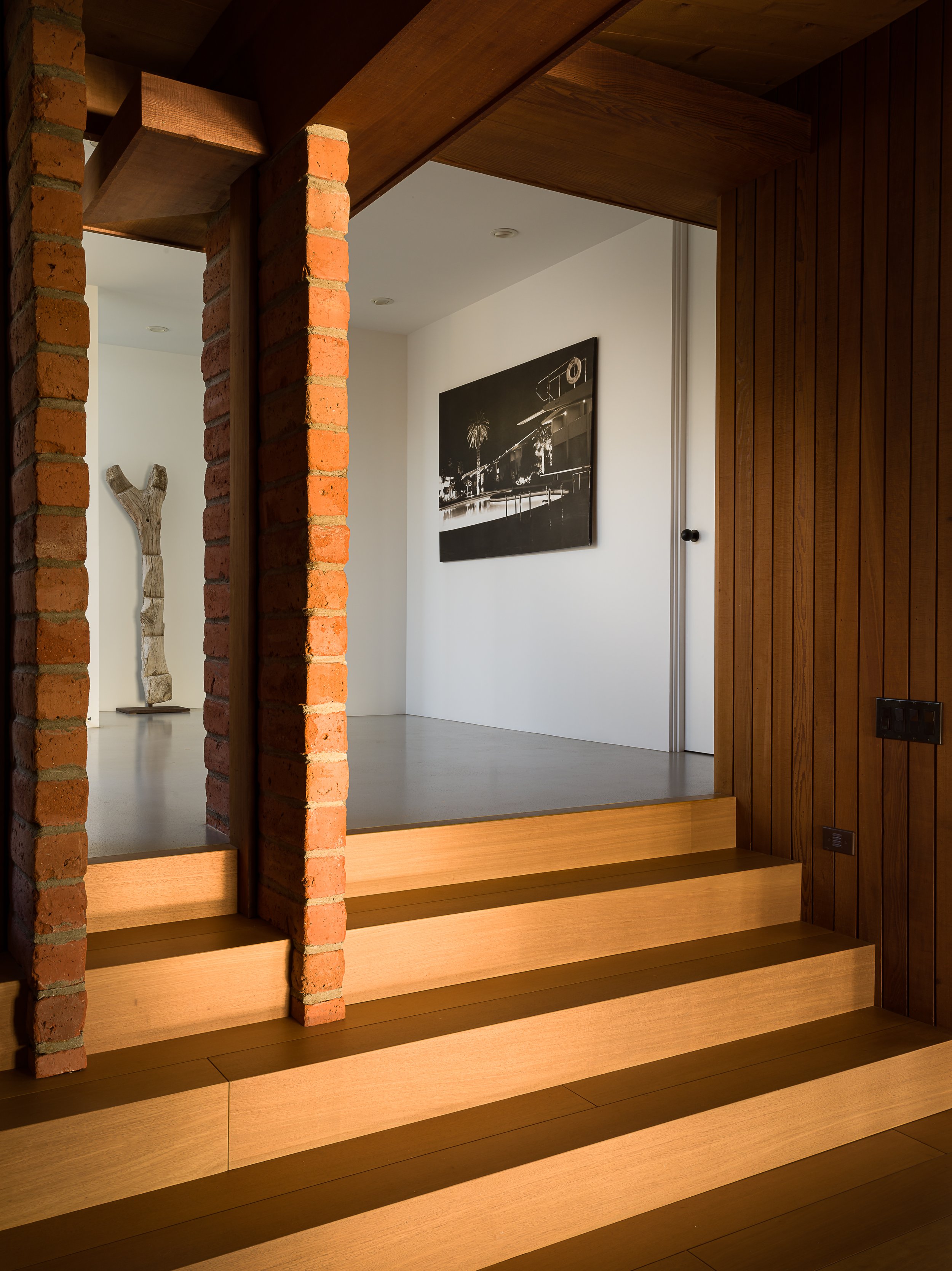 One of the earlier examples of Kellogg’s nature-inspired work featuring plate glass and rough-sawed wood, the 3BR, 4BA 2,527sq ft home sits on a 7,125 sq ft lot. There’s a mix of soaring and more intimate spaces; the double-height living and dining area draws families together around the fireplace, made with Kellogg’s signature bricks.